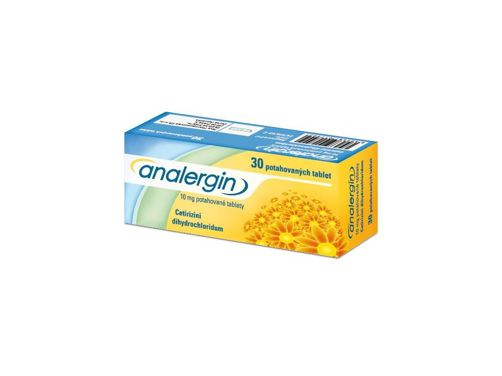Zaskočila vás pylová sezóna nebo nečekaná alergická reakce? Analergin 10 mg ve standardním balení 30 tablet je ideální první pomocí do každé domácí lékárničky. Účinná látka cetirizin rychle blokuje působení histaminu a přináší úlevu od kýchání, ucpaného nosu, svědění očí i projevů kopřivky. Balení pokryje zhruba měsíční potřebu dospělého člověka. Vhodné pro dospělé a děti již od 6 let. Volně prodejný lék k vnitřnímu užití. Čtěte pozorně příbalový leták.